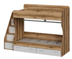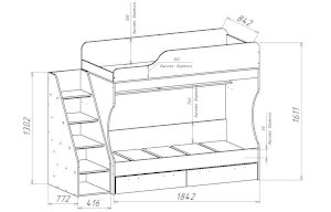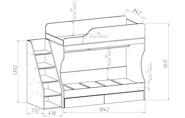 Кровать двухъярусная с двумя выкатными ящиками. Ящики на колесиках (к кровати не крепятся). В лестнице полезное пространство: четыре ниши за дверками.