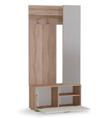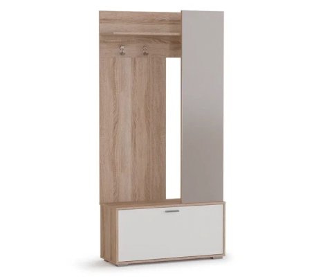 Прихожая Лайт компактна и вместительна, идеальное решение для помещений с маленькой площадью. В ней оптимальный набор модулей: вешалка с двумя крючками для верхней одежды и полкой для головных уборов, тумба для обуви с механизмом газлифт, который надежно фиксирует дверцу в открытом и закрытом положении. Скрытая за зеркальным полотном секция со штангой по вместимости заменяет небольшой шкаф. Зеркало не только служит декоративной ширмой, но и визуально расширяет пространство. Универсальный светлый дизайн в цветах дуба сономы и белого – верх элегантности и воздушности, который вписывается в прихожую любых размеров.