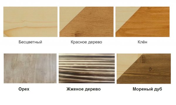 Цвета на выбор: бесцветный, клён, орех, красное дерево, морёный дуб, жженое дерево.
