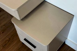Благодаря своему дизайну трюмо «Катрин» легко впишется в любой интерьер и гармонично сочетается с другими модулями спальни «Катрин». Выкатные ящики предоставляют достаточно места для хранения различных предметов, а возможность использования трюмо в качестве письменного стола делает его универсальным элементом мебели.