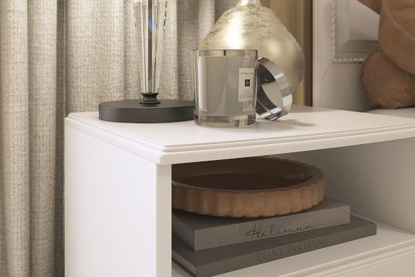 Прикроватная тумба – самый маленький, но в то же время незаменимый модуль серии «Белла». Используйте его как подставку для ночника, а также для хранения самых необходимых вещей как в открытой нише, так и в закрытом выдвижном ящике. Столешницу из МДФ украшает фрезеровка.