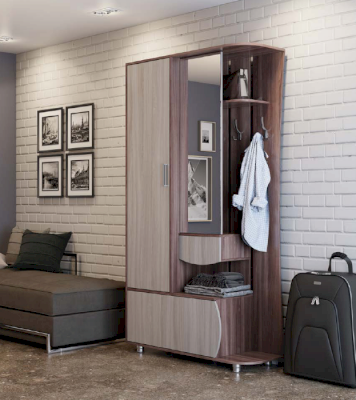 Прихожая «Элен» подходит для небольших помещений. Она компактна, но при этом весьма функциональна. В платяном шкафу и на открытой вешалке есть место для головных уборов и одежды, на полочках удобно хранить сумки и зонтики. Очень важная деталь — большое зеркало, в которое можно смотреться, прихорашиваясь перед выходом в свет.