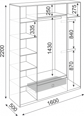 • В средней секции все полки жесткие; в левой секции: 4 - съемные и одна жесткая (средняя); в правой секции одна жесткая полка.
