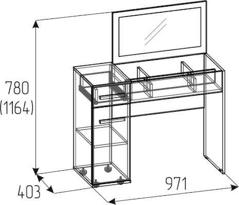 Простой с виду туалетный столик из коллекции Норвуд обладает интересной конструкцией. Откидная контрастная крышка стола скрывает нишу с органайзером для хранения мелких аксессуаров. На внутренней стороне крышки - зеркало, перед которым удобно наносить макияж и проводить косметические процедуры. Сбоку – отделение с полками за распашной дверцей и выдвижным ящиком, фасад которого выполнен из ЛДСП цвета Орех Шоколадный. Закрытый столик можно использовать для работы на ноутбуке или с документами. Модуль можно собирать как на левую, так и на правую сторону.